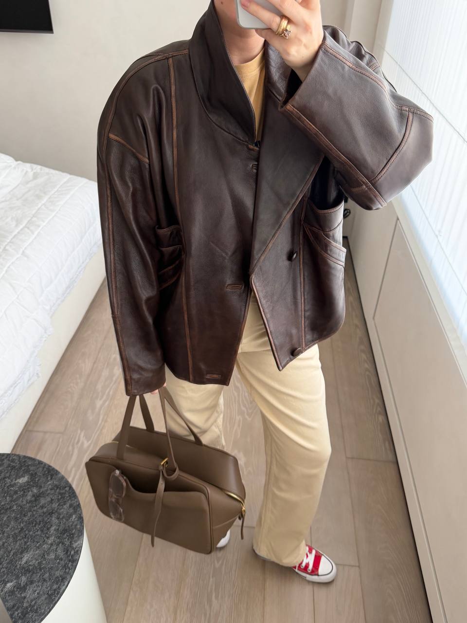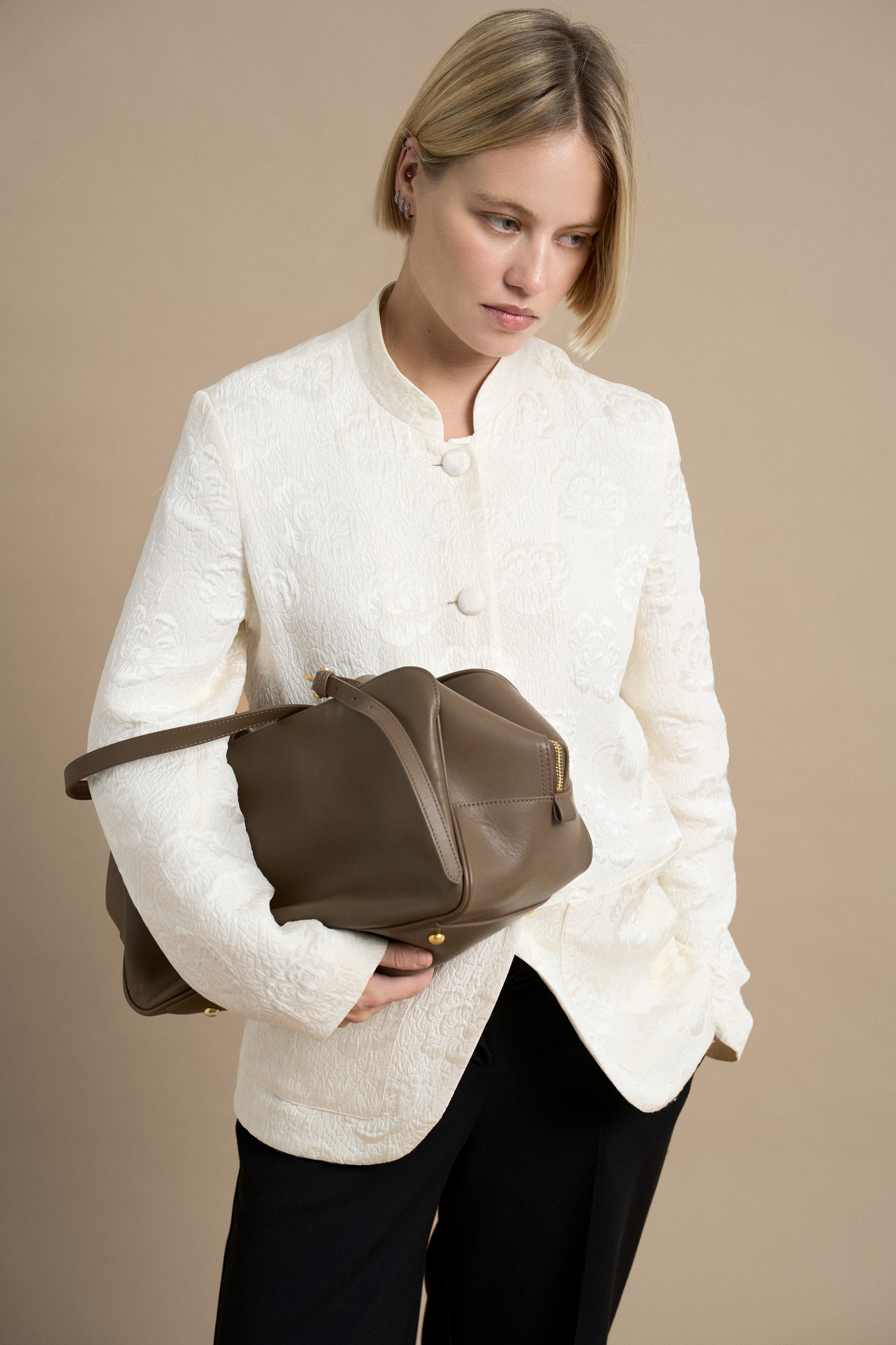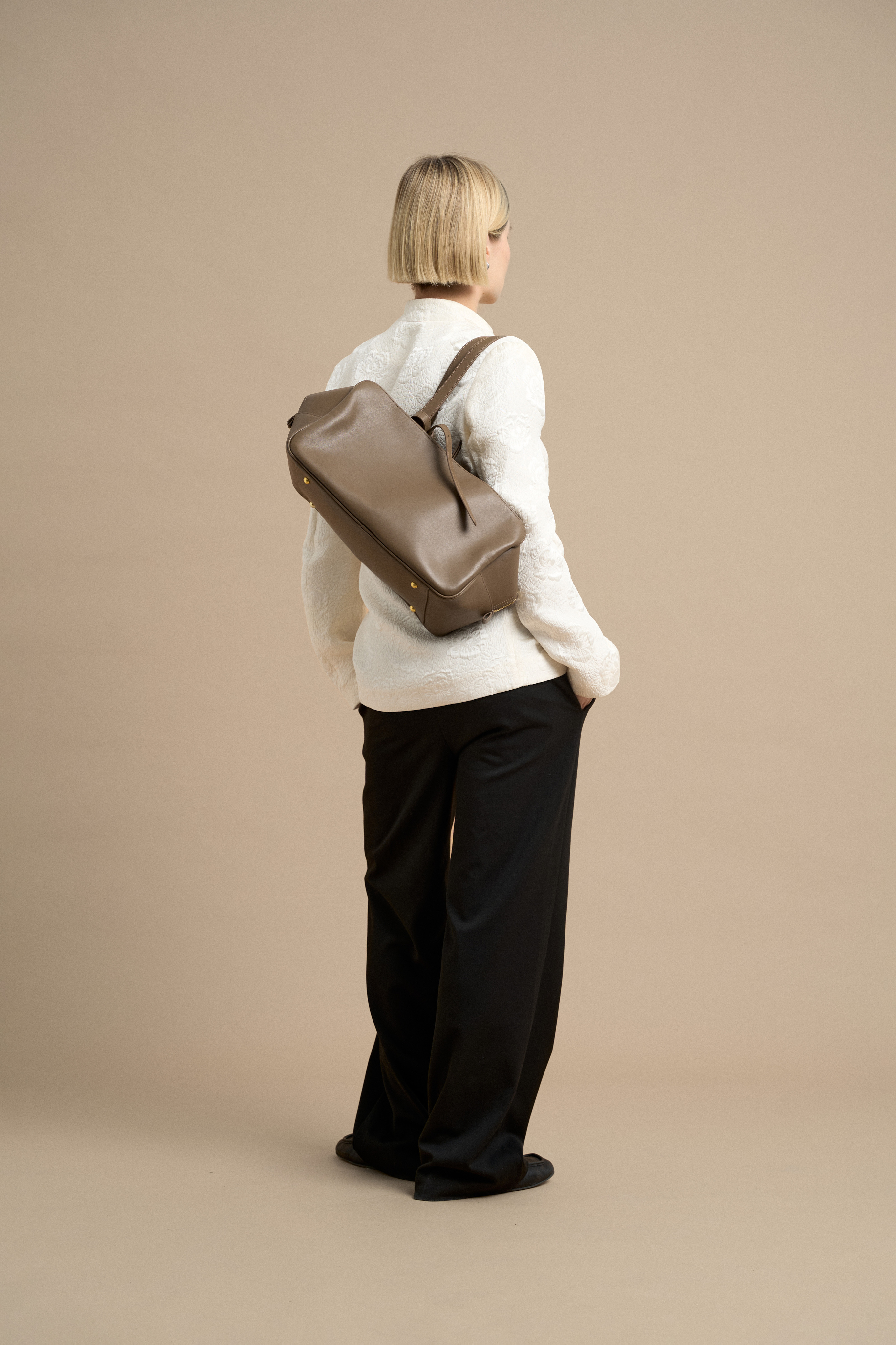 Чёткий силуэт сочетается с мягкостью гладкой кожи, благодаря чему сумка сохраняет форму, но остаётся живой и пластичной в движении. ARC удобно носить в руке или на плече — она органично вписывается в повседневный ритм и легко дополняет образ.