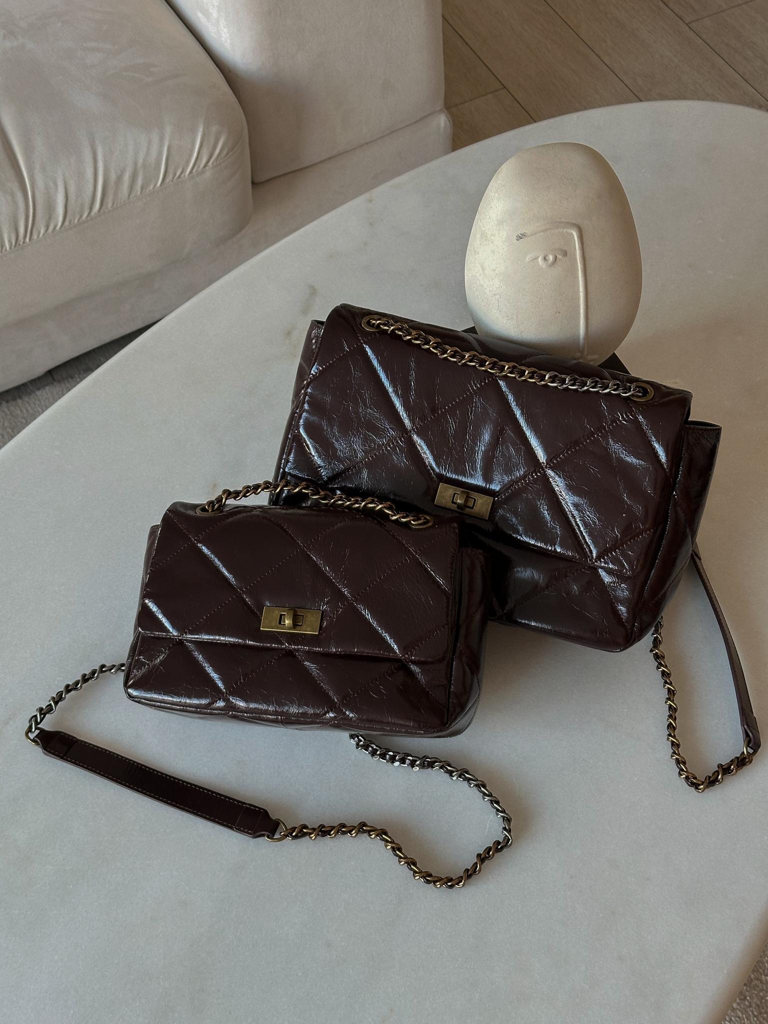 Нестареющая классика в современном исполнении. Мягкая, невероятно приятная на ощупь кожа с винтажной обработкой. Крупная стильная стежка. Прочная дорогая фурнитура. Цепочка, сочетающая в себе два оттенка: черненое серебро и бронза. Удобное внутреннее оснащение. Это все про модель KELLY.