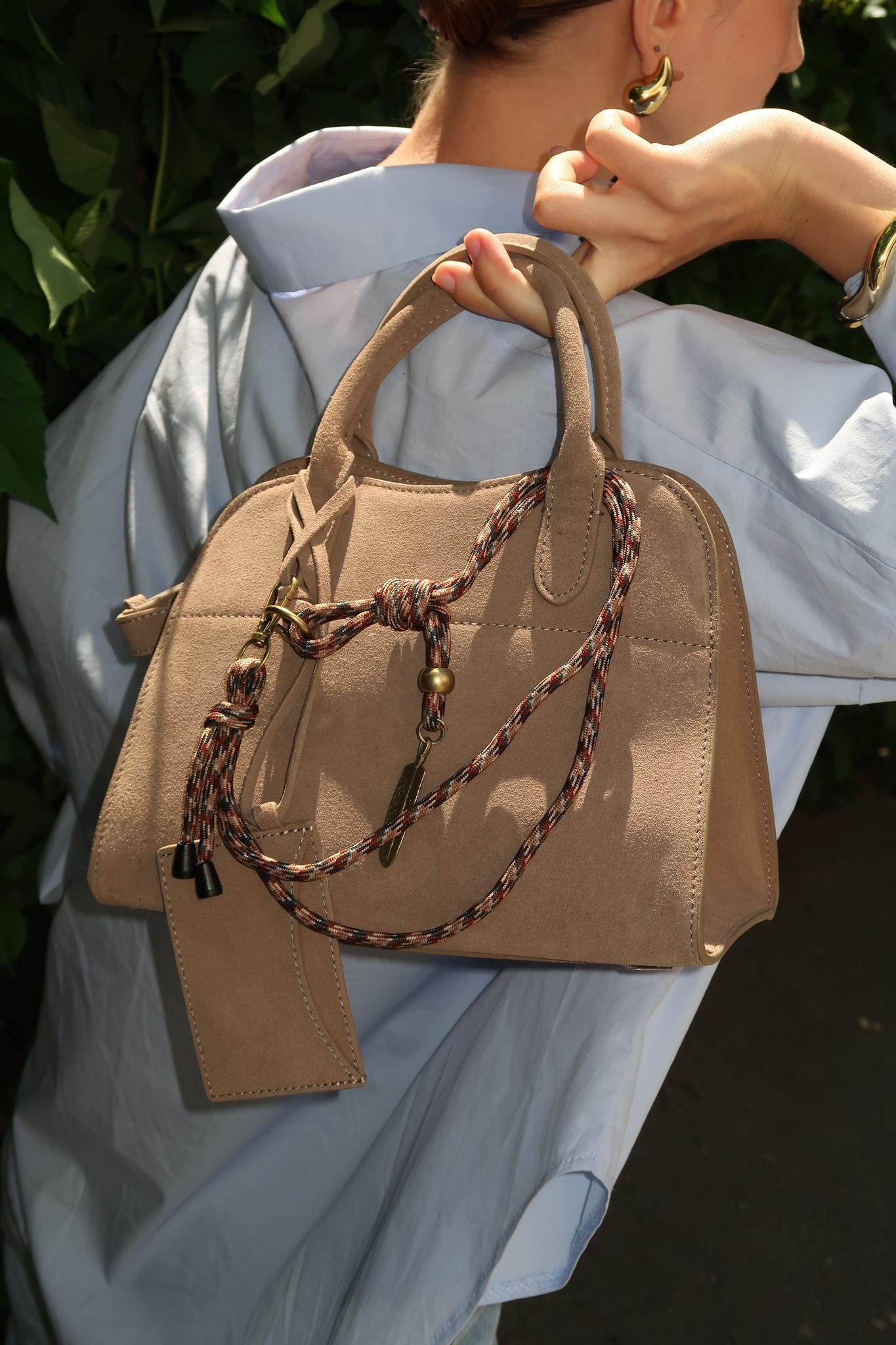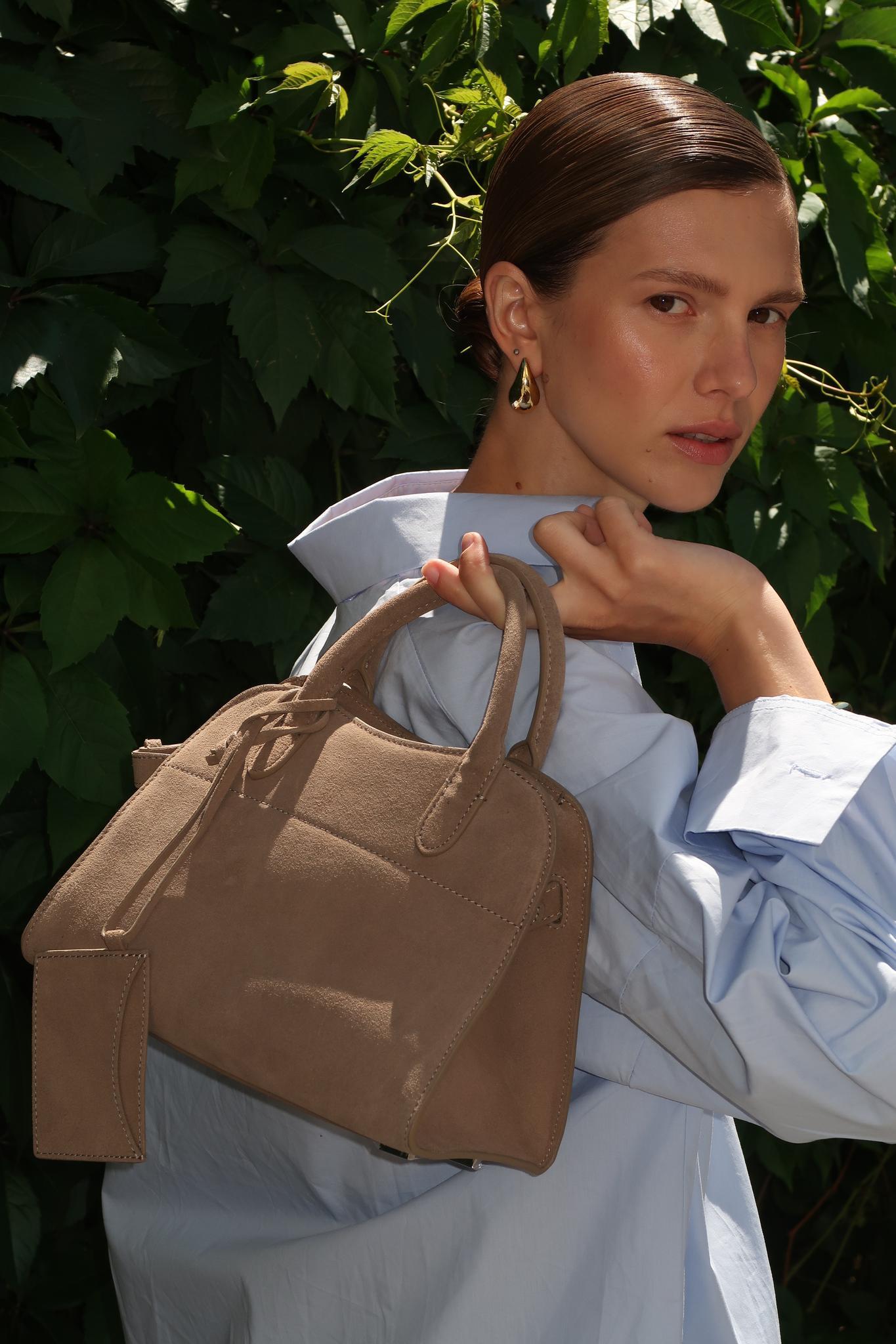 Сумка - саквояж на двух ручках самой актуальной формы теперь в формате мини. Сумка выполнена из натуральной премиальной итальянской замши. Удобная вместительная с широким дном. Также эта модель идеально впишется в любой ваш образ,как в городской повседневный, так и в офисный.