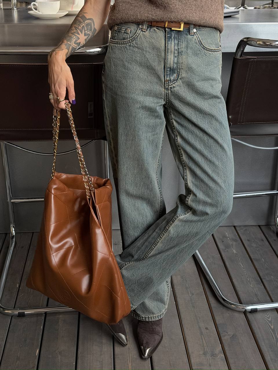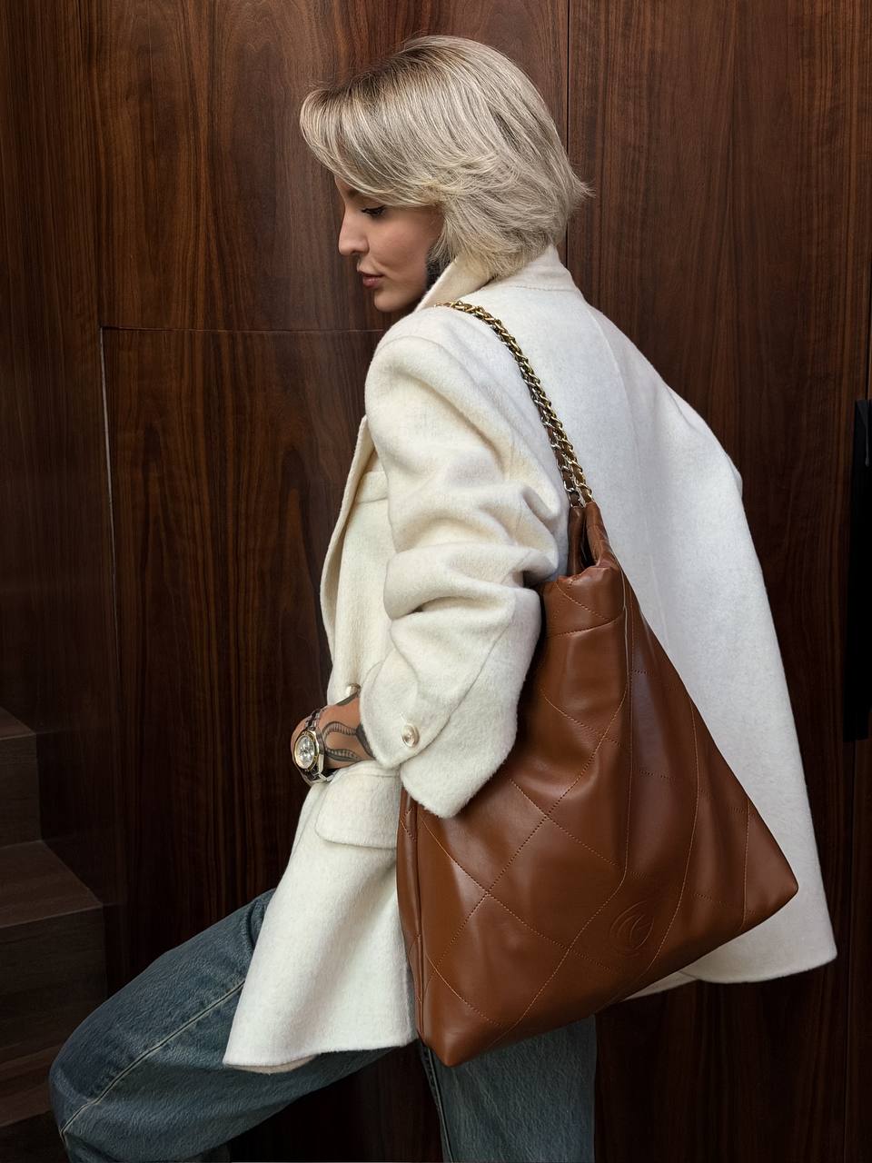 Ну и, конечно, нужно отметить особенность этой модели в возможности трансформации. Её можно носить как шоппер/мешок на плече, либо сложить, как клатч, и получить новую сумку, которая прекрасно дополнит даже вечерний образ.